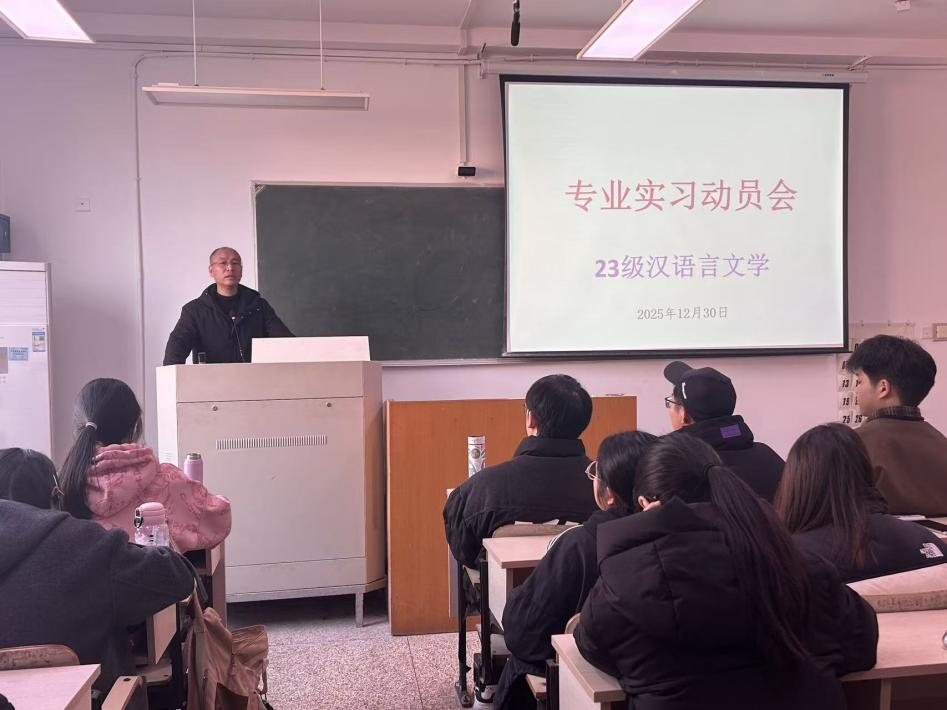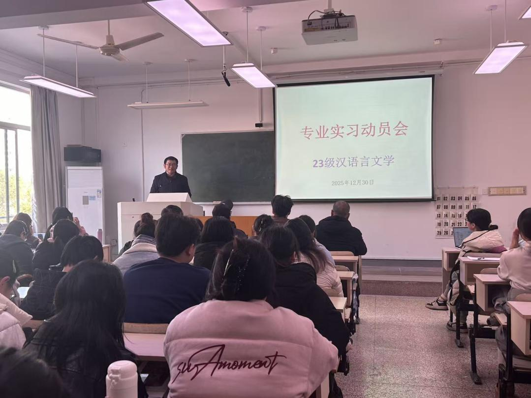 为切实做好2023级汉语言文学专业学生实习组织管理工作,明确实习目的、要求和纪律,保证实习工作安全有序地展开,人文学院于2025年12月30日中午于1306教室召开了2023级汉语言文学专业实习动员会。本次动员会由朱磊老师主持,林俊辉书记出席会议,全体汉语言文学专业学生共计60余人参加。
