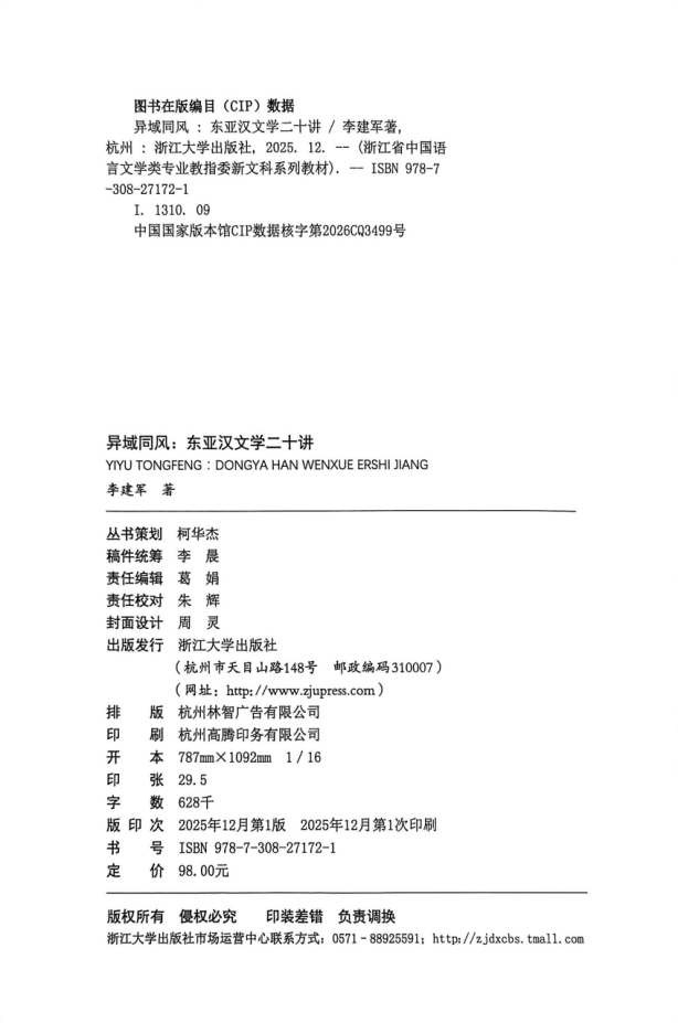 2025年12月,李建军教授出版教材《异域同风:东亚汉文学二十讲》。该书系作者多年深耕东亚汉文学研究的代表性成果,入选浙江省普通本科高校“十四五”重点立项建设教材,并列入中国语言文学类专业新文科系列教材。同时,本书亦为国家社会科学基金项目“10—14世纪东亚汉文学与儒学交汇理路研究”的重要阶段性成果。