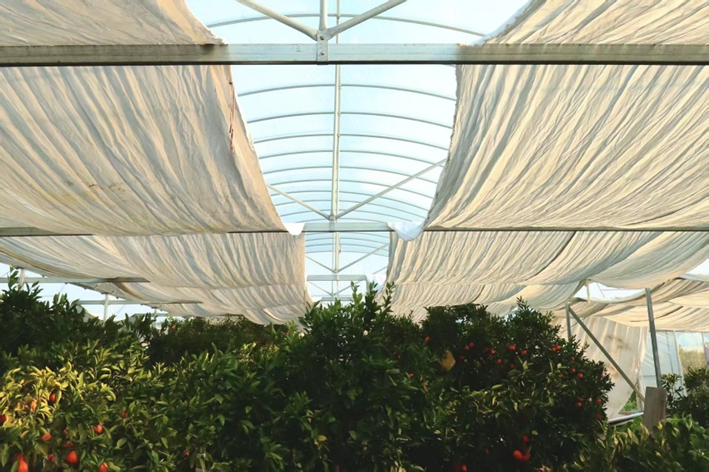 秉持绿色种植理念,基地以精细化管护打造蜜橘高品质。棚内摒弃化学防虫,采用挂瓶子、铺驱虫布的物理方式,从源头减少污染;为避免果实被阳光灼伤形成果肉发白的“太阳果”,夏季会为蜜橘套上白色锡膜或塑料袋,搭配遮阳网做好防护,全方位保障果实外观。