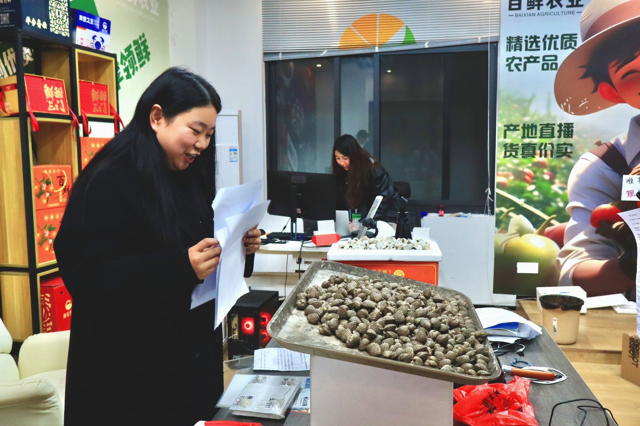 鲜甜共富工坊的直播区内,工作人员正为开播做最后的准备。林鹏向团队介绍:“工坊目前主打本地特色农产品,线上日均订单在500单左右。“我们现在血蛤库存就有20000斤,还是以线下批发为主,必须加快往线上转,真正做出自己的品牌!”他强调道。