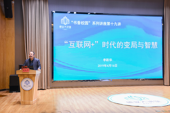 4月16日晚,人文学院副院长李跃华应邀做客德业大讲堂“书香校园”系列讲座第十九讲,作“互联网+时代的变局与智慧”讲座,校纪委书记吴国庆出席,椒江校区师生积极参与听讲。