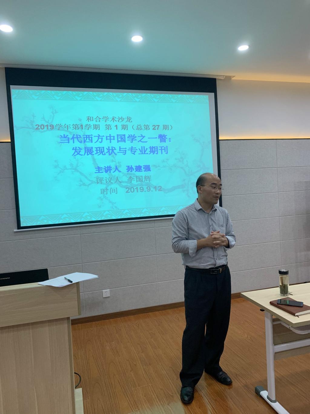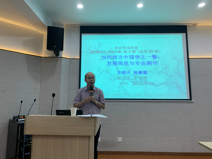 2019年9月12日晚,2019年学年第1期“和合学术沙龙”(总第27期)在人文学院4楼集训室举行。本期沙龙邀请荷兰莱顿大学博士,我院今年刚引进的优秀人才孙建强老师主讲,其题目为《西方中国学之一瞥:发展历程与专业期刊》。沙龙由副院长高平教授主持,李国辉教授担任主评人。