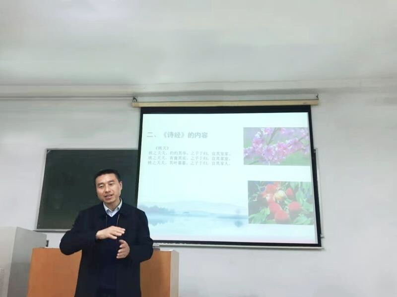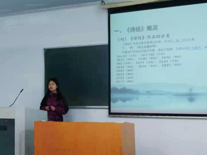 随后,徐旭敏老师主讲了汪曾祺的短篇小说《金大力》,在分析文本的基础上得出金大力当上瓦匠头儿的种种看似矛盾而又合理的原因,从而体现出汪曾祺对美好人性的呼唤,对“真”和“亲”的情感渴望。严胜英老师以《诗经》的“风、雅、颂”为主讲内容,通过对《卷耳》《女曰鸡鸣》《苕之华》《桃夭》等诗篇的赏析,明确国风之质朴、正乐之雅、颂为祭祀舞曲歌辞等知识点。