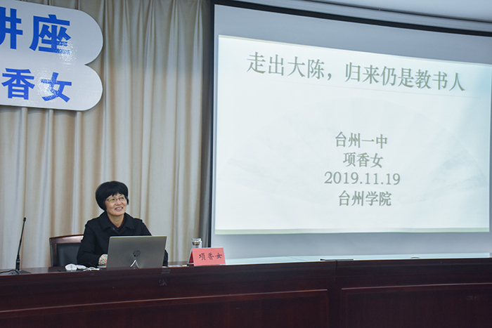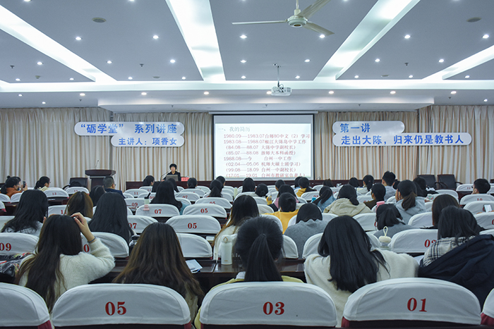 为不断加强与中学的合作交流,深度参与一线的教学教研活动,促进新一代青年教师的成长成才,自本学期始,人文学院推出“砺学堂”系列活动。11月19日晚,“砺学堂”第一讲于临海校区图书馆学术报告厅正式举行。活动由人文学院党总支书记郑丽君主持,特邀台州市教育杰出人物、著名特级教师项香女作教育思想专题报告会,特级教师工作站领衔人王针桂与17级汉语言文学(师范)专业学生一同参加。