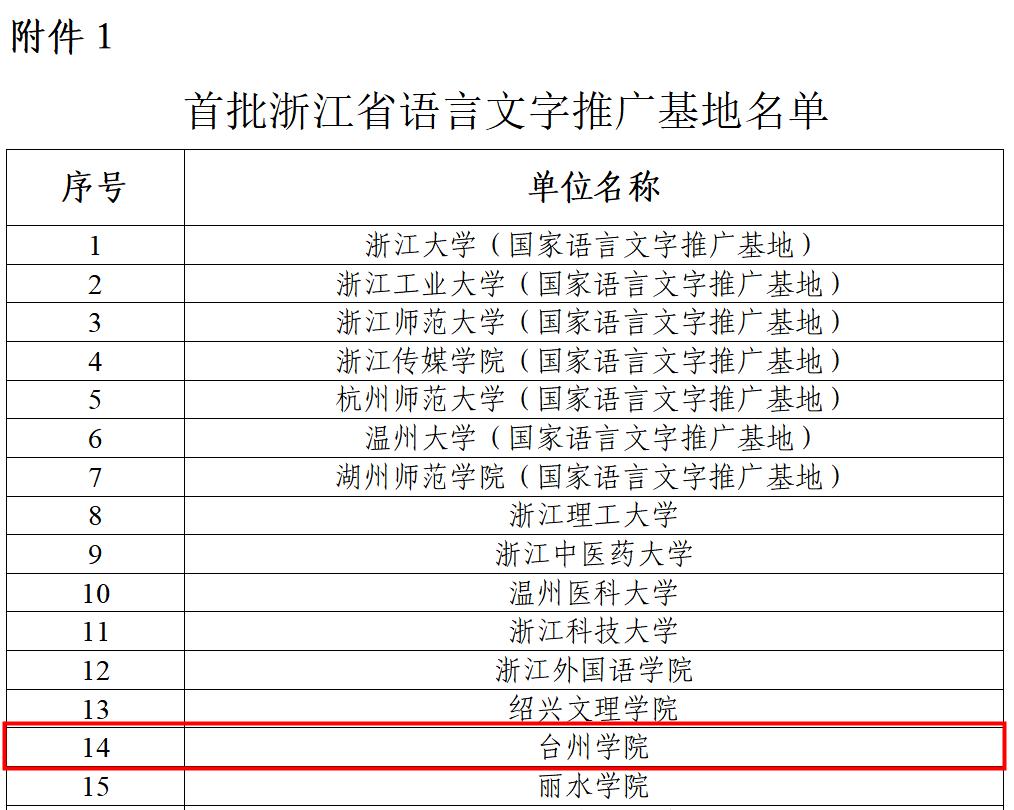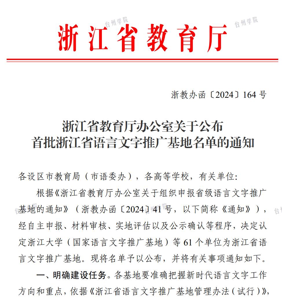 近日,浙江省语言文字工作委员会办公室发布首批浙江省语言文字推广基地名单,台州学院成功入选!作为我校语言文字推广基地实体所在部门,人文学院立足“一带一路”、乡村振兴等国家发展战略,致力于服务区域发展,围绕语言文字推广、文化传承创新、援疆双语支教、对外汉语教学、乡村文化保护、融媒体传播等方面,形成了以“工作室、研究院、产业学院、传播中心”为构架、功能完整清晰的语言文字建设格局。