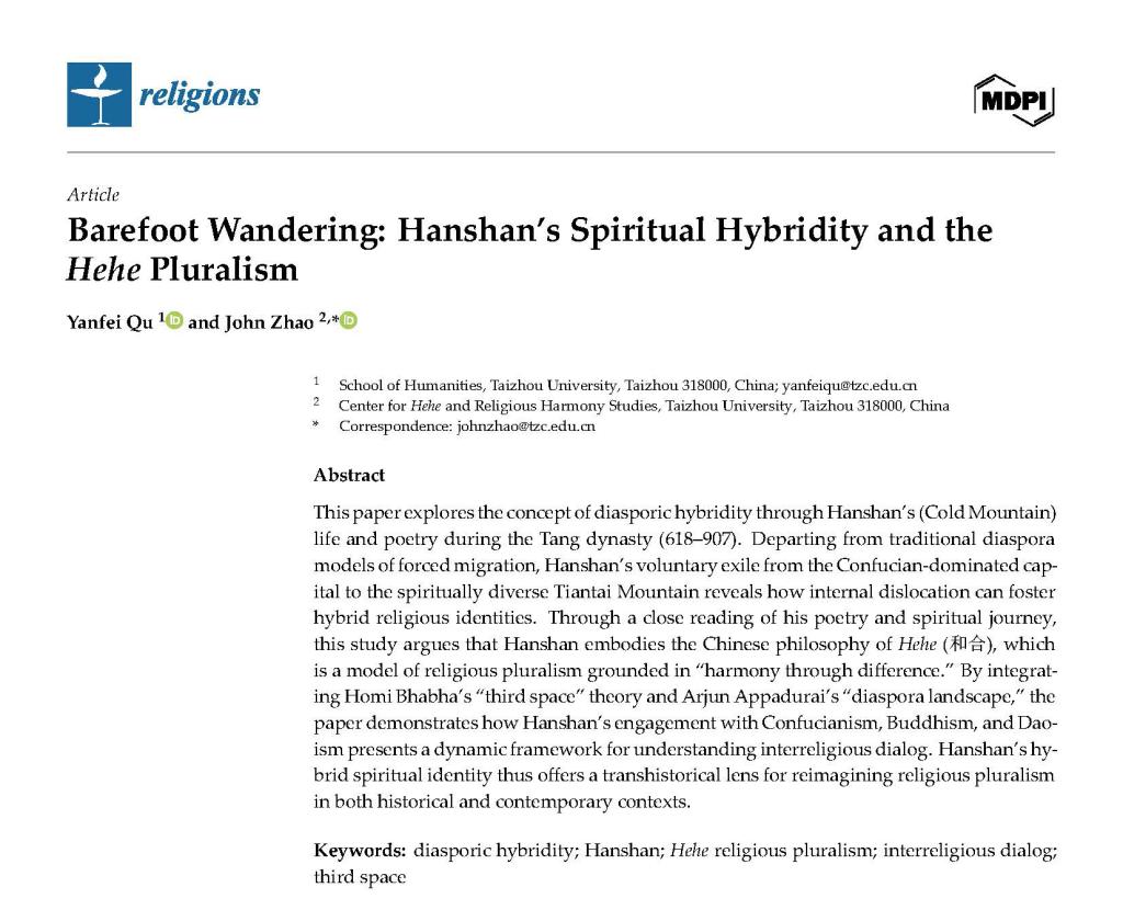 本院讯我院屈燕飞副教授与马克思主义学院赵轩博士合作完成的论文《芒鞋踏歌:寒山灵性之融与和合之境》(Barefoot Wandering:Hanshan's Spiritual Hybridity and the Hehe Pluralism)近日正式发表。该研究突破了传统宗教多元论的西方理论框架,首次系统性地阐发了“和合多元主义”(Hehe Pluralism)这一植根于中国思想传统的理论范式,为全球宗教哲学研究贡献了中国智慧。该研究的首要创新在于拓展了“流散”(diaspora)...